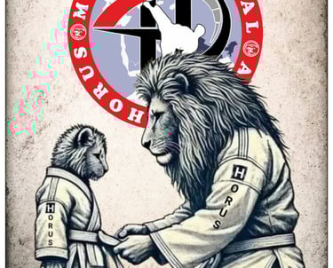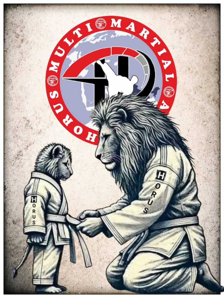 इस छवि में एक शेर अपने शावक को बेल्ट बांध रहा है, जो एक गहरी शिक्षा, सम्मान, प्रेम, देखभाल और संस्कार का प्रतीक है। Horus Multi Martial Arts में भी गुरु और शिष्य के बीच यही संबंध होता है—
